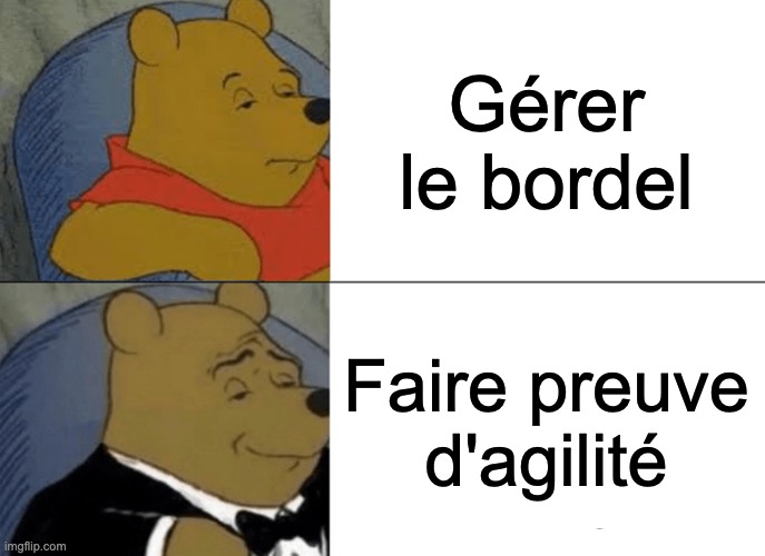 Fut un temps, on parlait de « parcours professionnel chaotique pour s’adapter à un monde du travail bordélique ». Aujourd’hui on dit « agilité de carrière ». Quand on vous demande d’être plus agile en entreprise, ça fait souvent référence à la « méthode agile », un mode de gestion de projet centré sur les cycles courts, la réactivité et la flexibilité. C’est une méthode bien définie et très codifiée. Alors, quand on vous invite à être « plus agile », mais sans les marqueurs de la méthode qui vont avec (scrum master, sprint, incrément, etc.), c’est qu’on essaie de vous la faire à l’envers. En réalité, on vous demande juste d’encaisser le bordel ambiant et de vous en dépatouiller dans un grand élan de « positivité toxique ».
